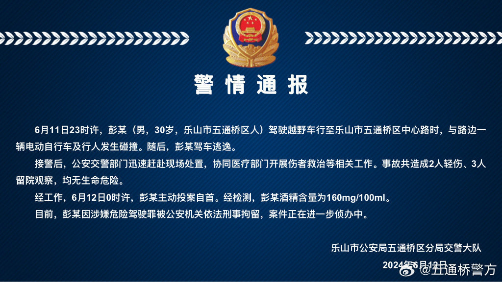 根据通报,6月11日23时许,彭某(男,30岁,乐山市五通桥区人)驾驶越野车行至乐山市五通桥区中心路时,与路边一辆电动自行车及行人发生碰撞。随后,彭某驾车逃逸。