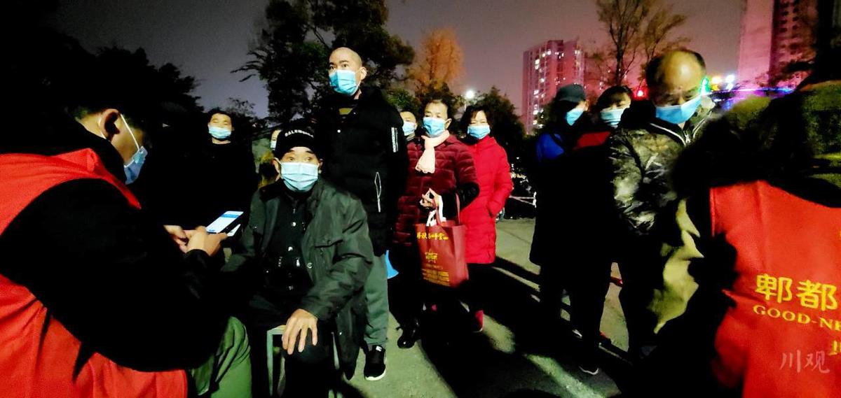 当晚7时许,记者在郫都区红光街道合兴社区看到,当地居民已经排起长队开始接受核酸检测。