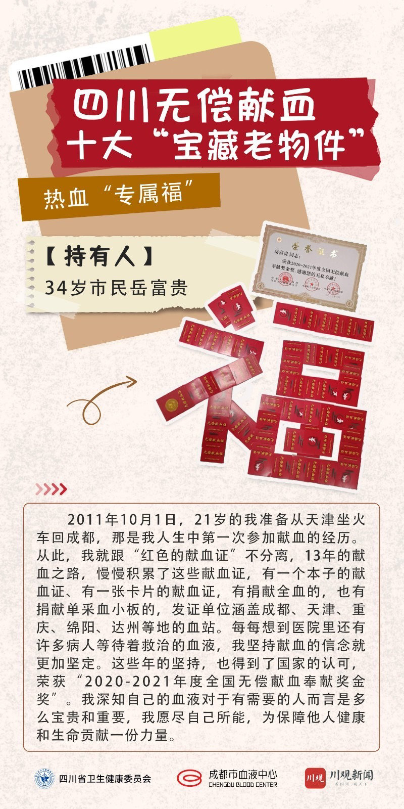 渐渐地,岳富贵坚持每年都到血站去献血,从捐献全血到捐献血小板,他收藏的献血证发证单位覆盖到了他走过的几乎所有城市,“成都、天津、重庆、绵阳、达州等地,有的是工作的地方,有的是出差或者旅游去的地方。”