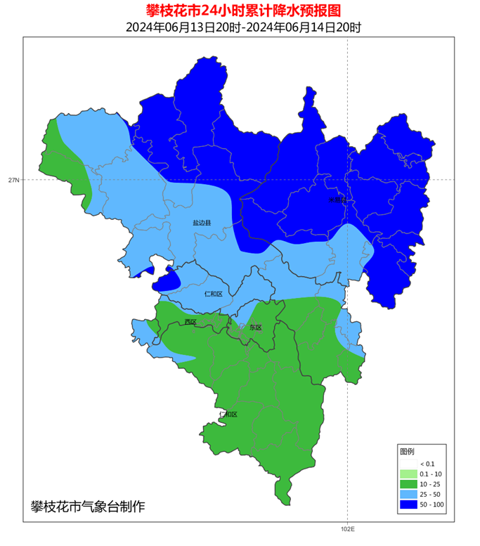 攀枝花市气象台2024年6月13日16时00分发布暴雨蓝色预警: