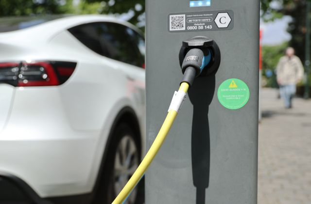 6月6日,在比利时布鲁塞尔,一辆电动汽车在欧盟委员会附近一充电站充电(资料照片)。 新华社记者 赵丁喆 摄