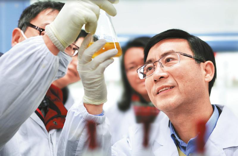 “千人计划”专家陈元伟(右一)在企业实验室进行医药试验。(省人才办供图)