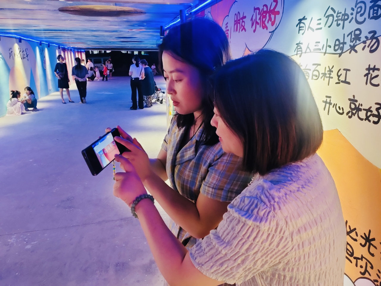 6月12日晚,改造后的绵阳市游仙区涪江街道韩家脊社区三汇绿岛下穿桥洞“星光璀璨”,顶部彩绘的“宇宙星空”,两边墙壁的大鹅、兔子、人像及俏皮的卡通漫画等形象吸引了众多市民和网红前来打卡。