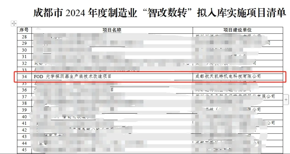6月7日,根据《四川省经济和信息化厅办公室关于做好2024年制造业智能化改造数字化转型项目(切块资金项目)入库工作的通知》(川经信办函〔2024〕130号)要求,经企业自主申报、区(市)县初审推荐、现场审核、专家评审等程序,菁蓉镇企业成都航天凯特机电科技有限公司(以下简称:航天凯特)FOD光学探测器生产线技术改造项目入选2024年度省制造业“智改数转”拟推荐入库项目名单。