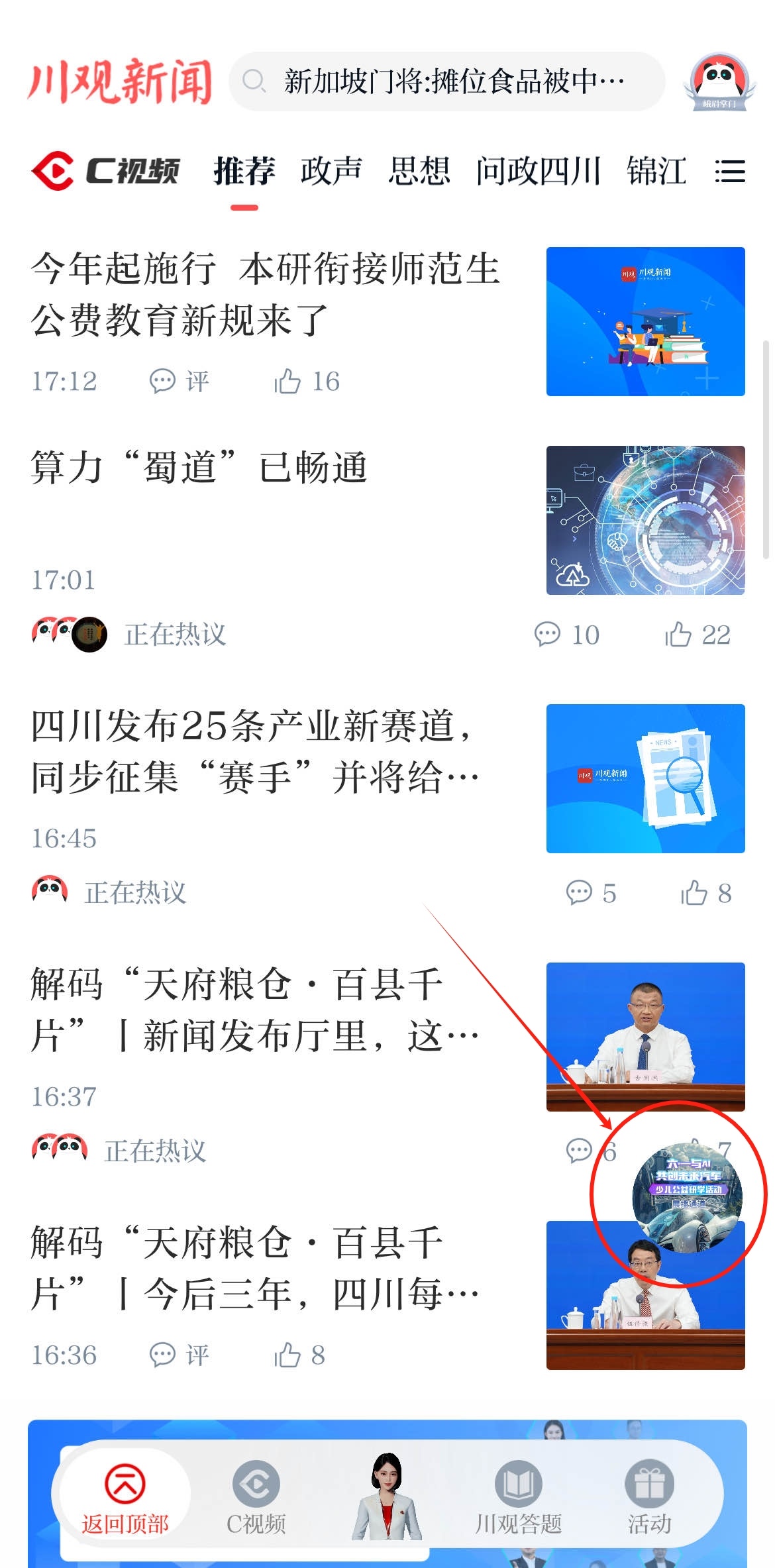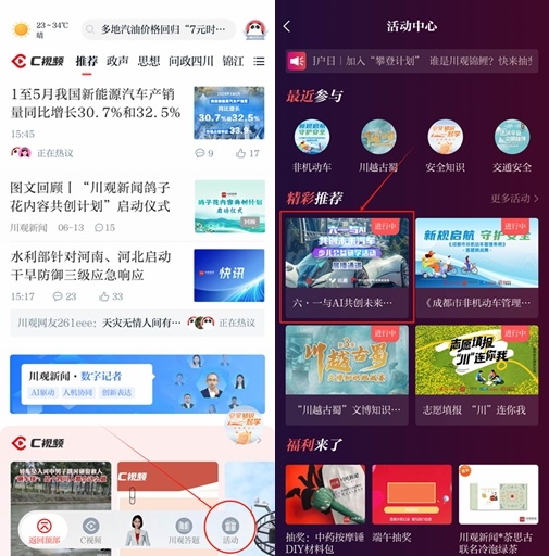 方式一:在川观新闻首页,点击右下方悬浮球,找到“六·一与AI共创未来汽车”少儿公益研学活动,点击即可参与;