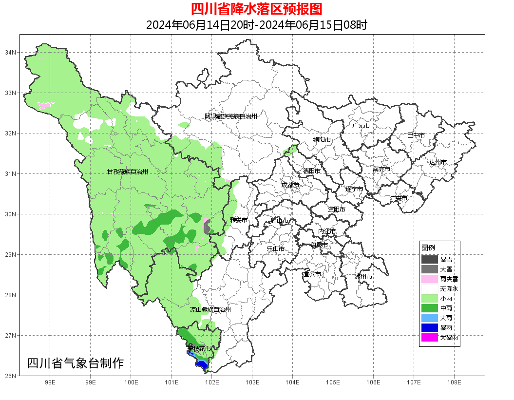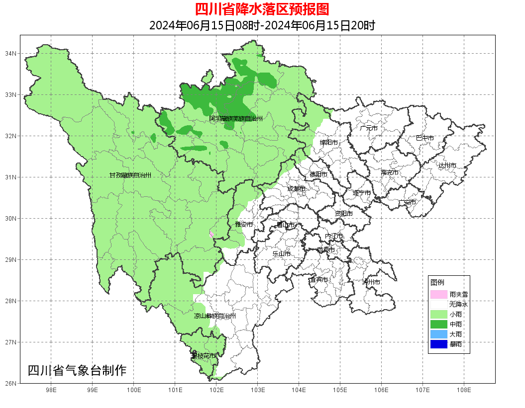 未来三天,我省自西向东有一次降水天气过程,其中15日川西高原和攀西地区西部的部分地方有中到大雨;15日晚-16日晚盆地部分地方和攀西地区有中到大雨,局部暴雨,并伴有短时阵性大风。需防范局地滑坡、泥石流等地质灾害的发生。