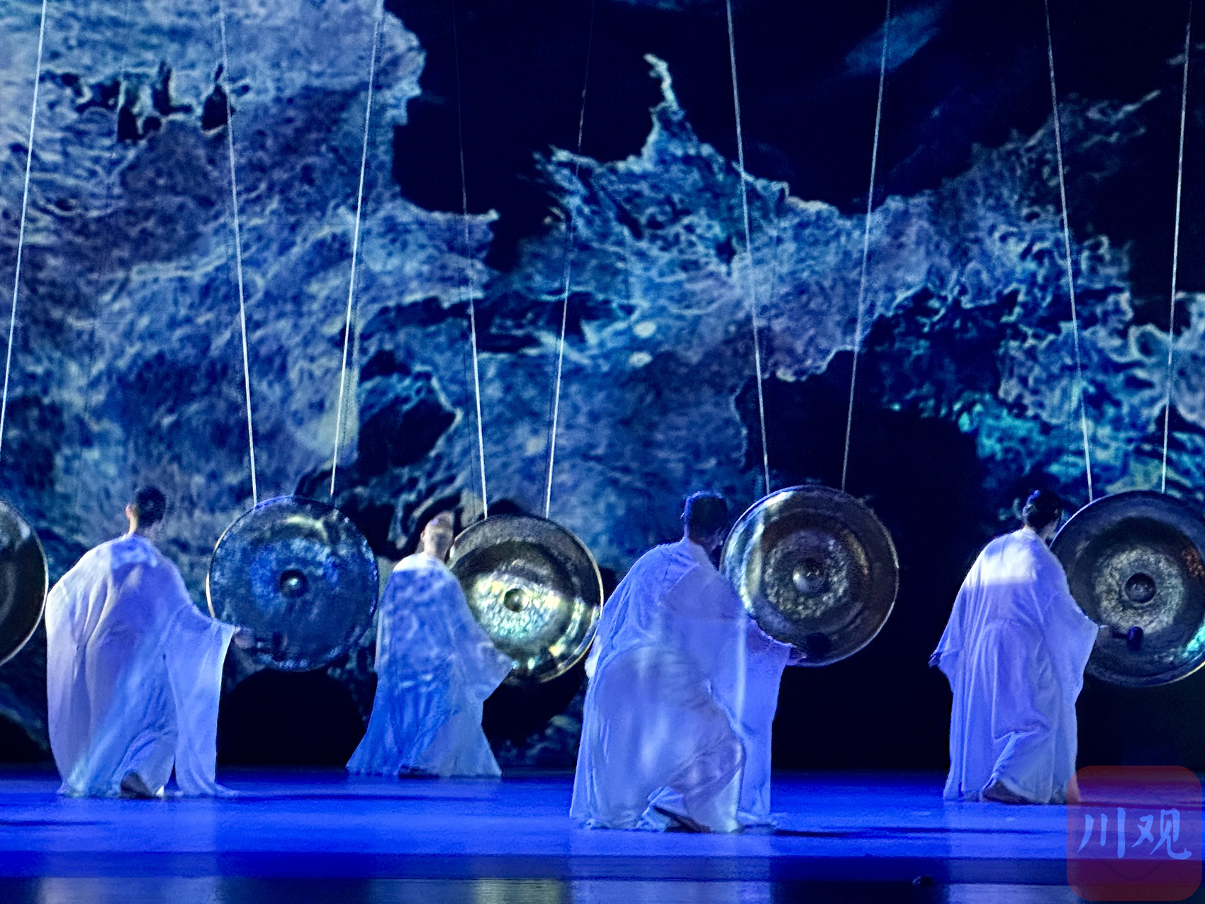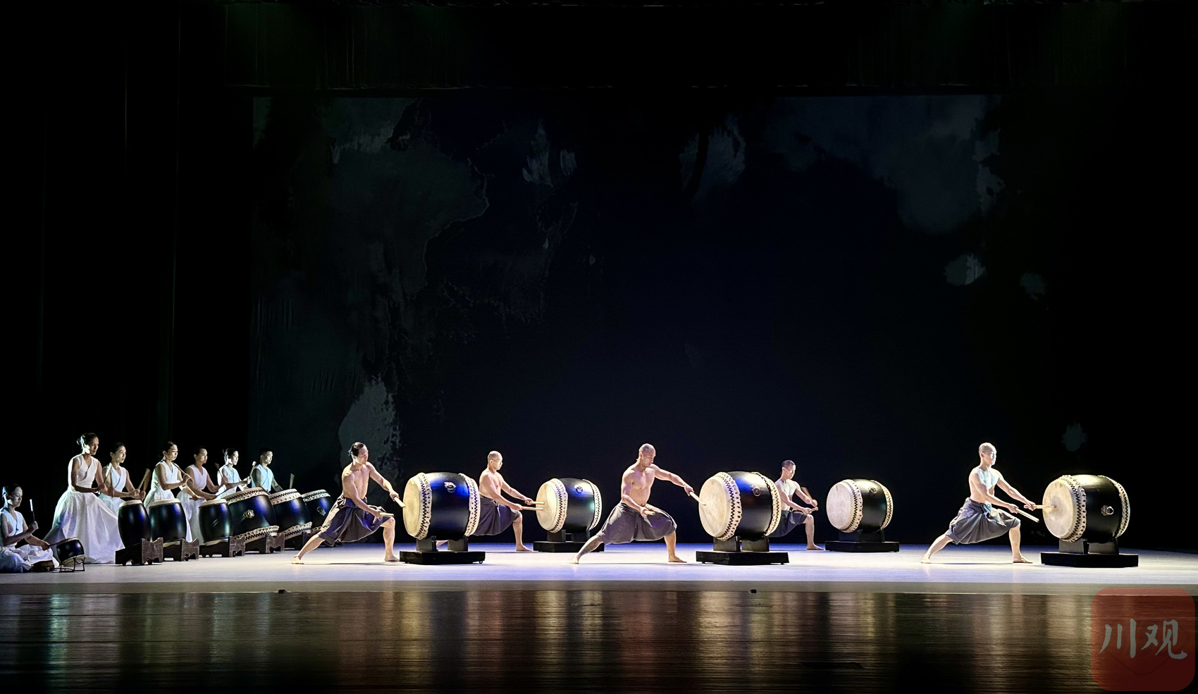 演出中,表演者们身着古朴的白色衣衫,在舞台上击鼓、起舞、吟唱,以极具张力的肢体语言诠释墨色变化与生命律动,将击鼓结合巨型铜锣、瑟、笛等呈现音乐新风貌,通过肢体表演、多层次鼓声叩问“道”之为何。