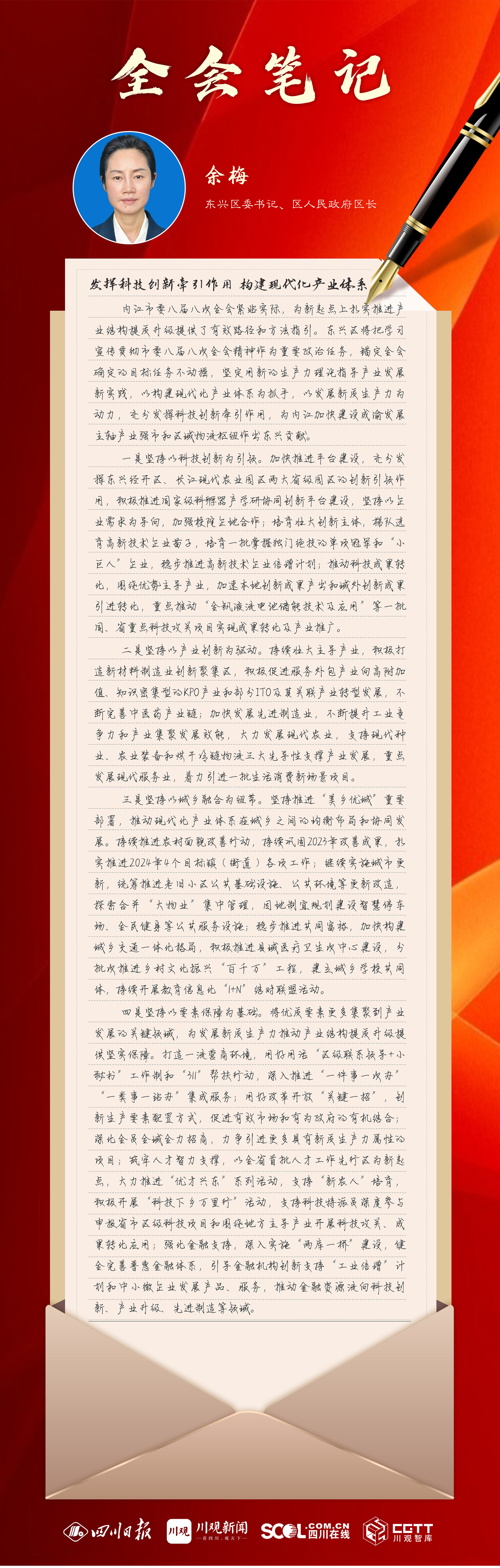 内江市委八届八次全会紧贴实际,为新起点上扎实推进产业结构提质升级提供了有效路径和方法指引。东兴区将把学习宣传贯彻市委八届八次全会精神作为重要政治任务,锚定全会确定的目标任务不动摇,坚定用新的生产力理论指导产业发展新实践,以构建现代化产业体系为抓手,以发展新质生产力为动力,充分发挥科技创新牵引作用,为内江加快建设成渝发展主轴产业强市和区域物流枢纽作出东兴贡献。