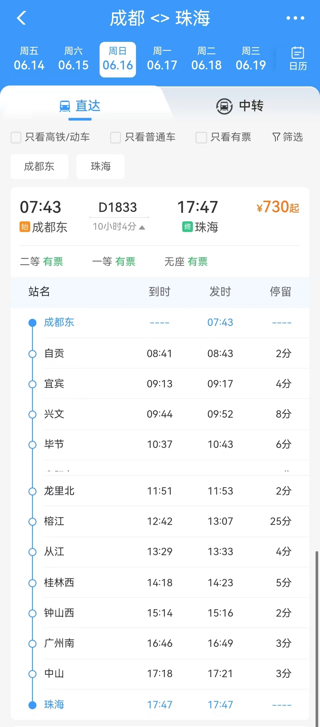 成都至珠海车票已开售