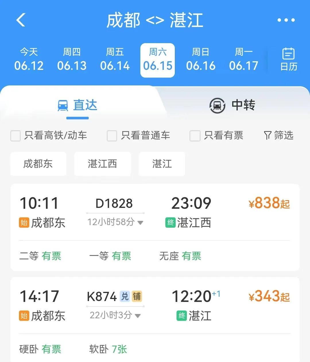 成都至湛江的D1828次列车