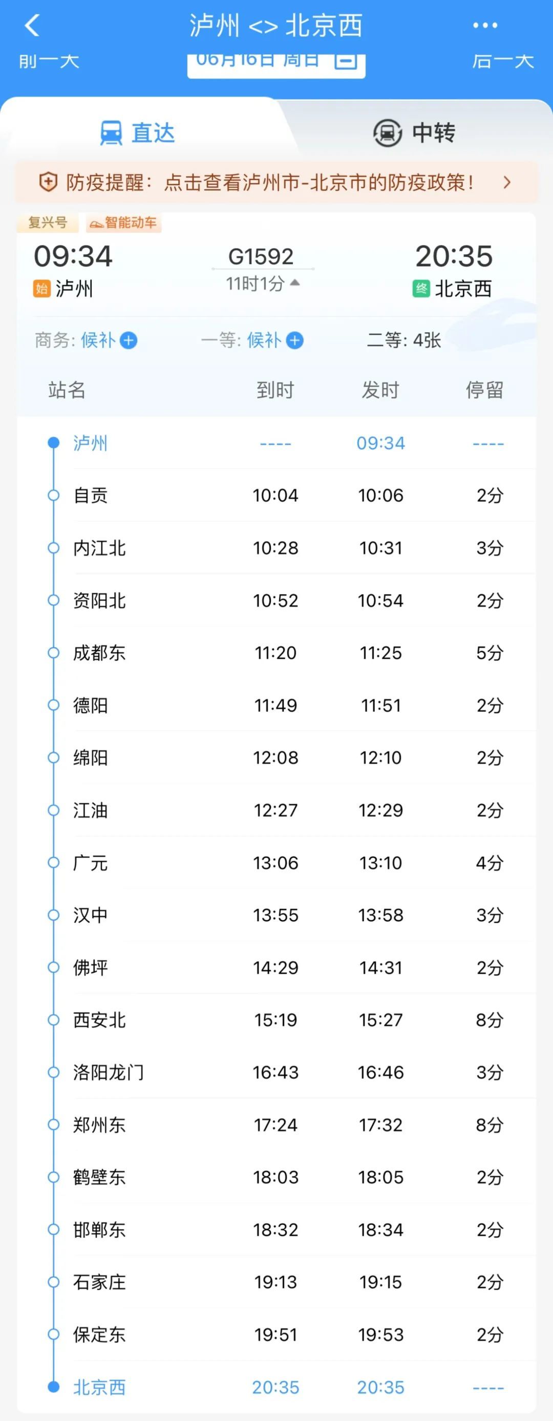 泸州09:34开车,北京西20:35终到