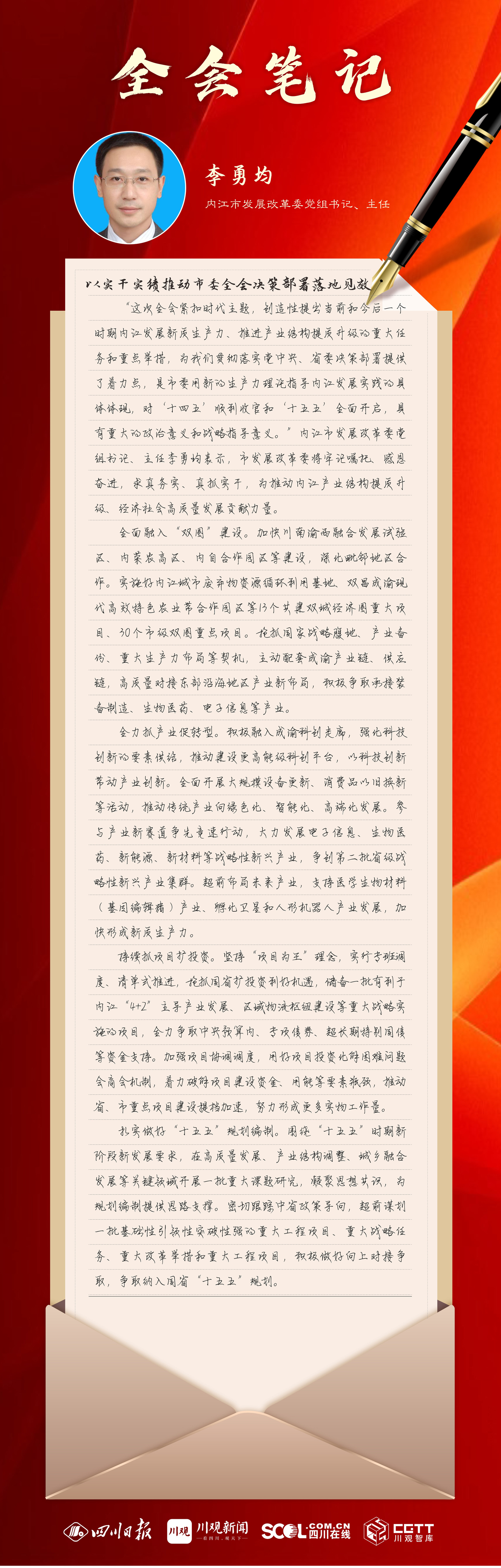 “这次全会紧扣时代主题,创造性提出当前和今后一个时期内江发展新质生产力、推进产业结构提质升级的重大任务和重点举措,为我们贯彻落实党中央、省委决策部署提供了着力点,是市委用新的生产力理论指导内江发展实践的具体体现,对‘十四五’顺利收官和‘十五五’全面开启,具有重大的政治意义和战略指导意义。”内江市发展改革委党组书记、主任李勇均表示,市发展改革委将牢记嘱托、感恩奋进,求真务实、真抓实干,为推动内江产业结构提质升级、经济社会高质量发展贡献力量。