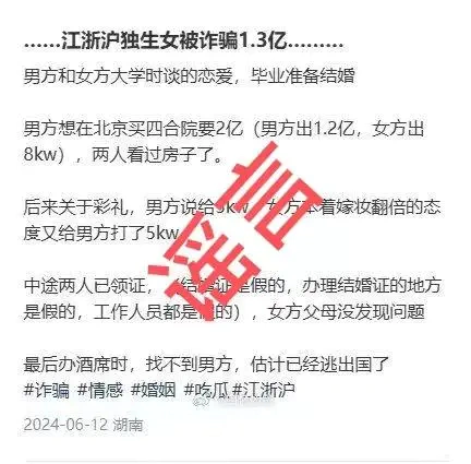 近日,多个群聊记录及帖文称,江苏无锡一独生女与他人恋爱结婚,遭男方骗取财产共1.3亿元。