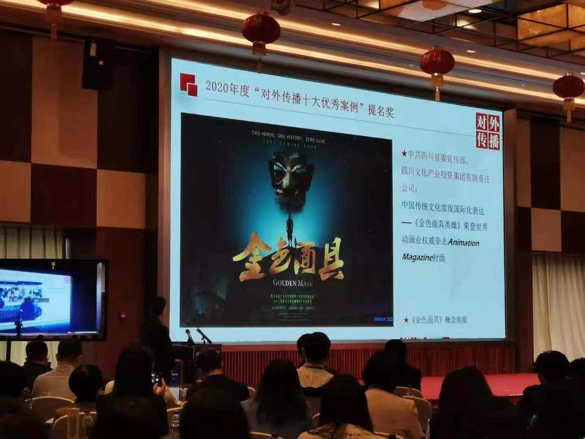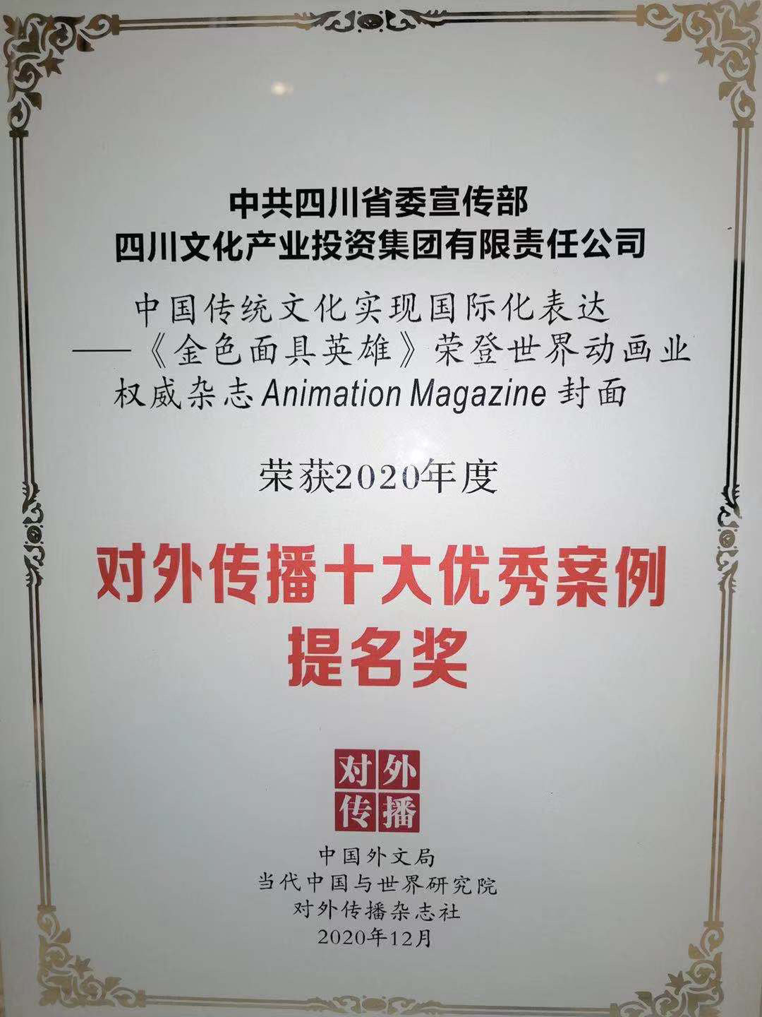 12月11日,由中国外文局主办的2020年全国外宣工作协作会在海口召开。会上,当代中国与世界研究院《对外传播》杂志发布了“2020年度对外传播十大优秀案例”,并举行颁奖表彰活动。四川省委宣传部、四川文投集团报送的案例《中国传统文化实现国际化表达——<金色面具英雄>荣登世界动画业权威杂志Animation Magazine封面》从众多参评案例中脱颖而出,荣获“2020中国对外传播十大案例”提名奖。