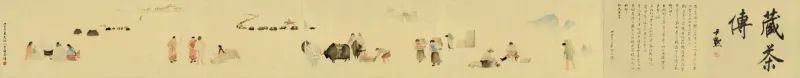 《藏茶传》画高38.4厘米,长299.7厘米。再加上引首,全长近4米。《藏茶传》除引首外,整幅长卷从右到左描绘的是汉茶入藏到改装藏茶、乌拉娃背茶、牦队运茶、集市易茶、牧民煮茶的场景,画面之间并无明显界限,一帧接一帧扑面而来,完整地呈现了雅安藏茶从生产、运输、加工、销售到品饮的全过程,令人叹为观止。