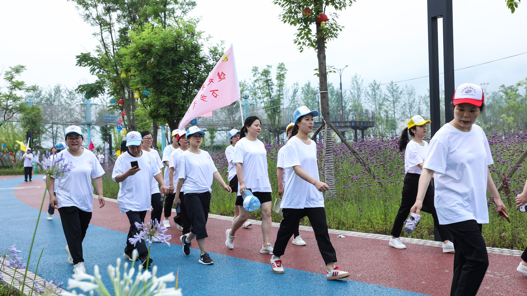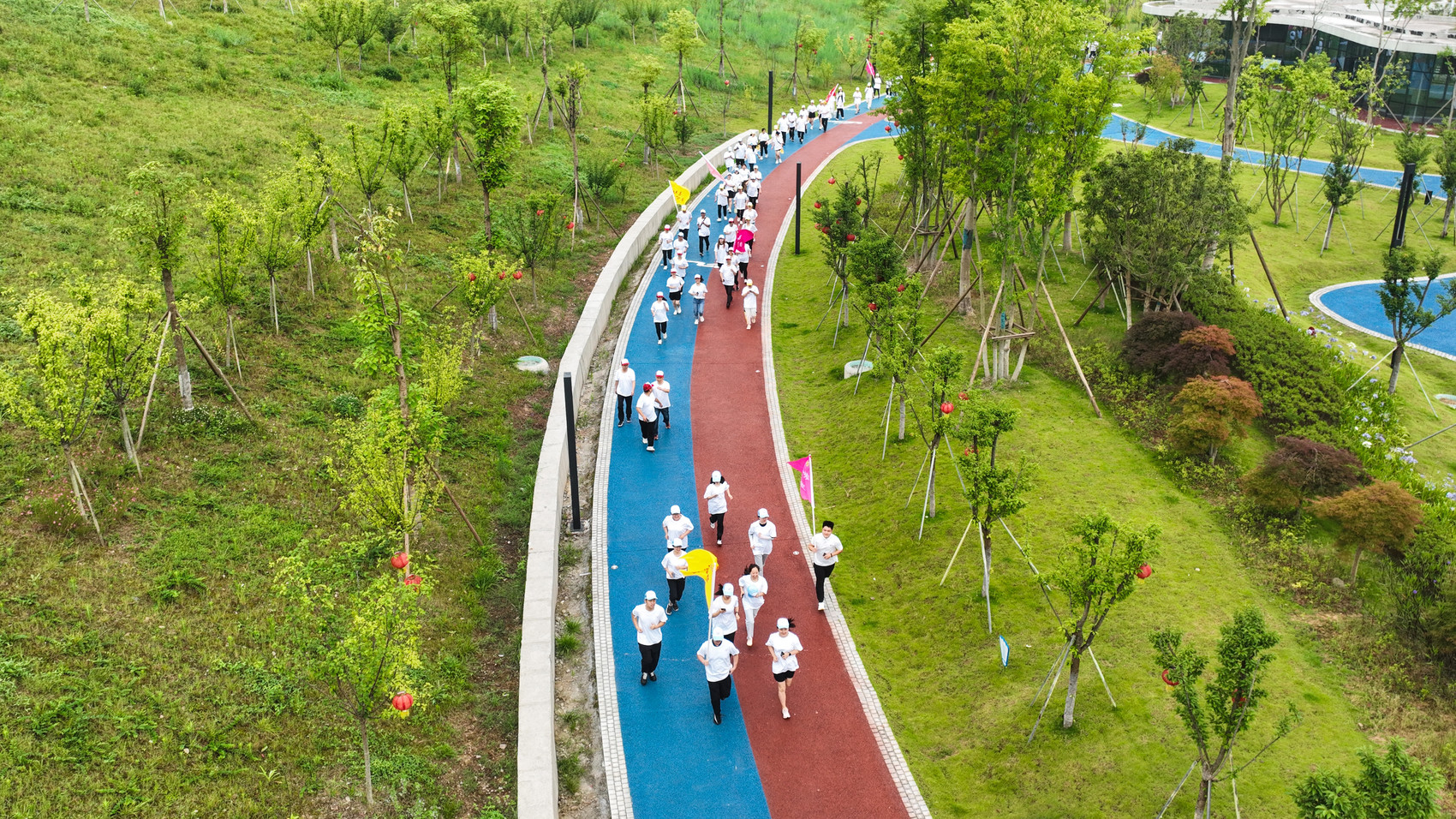 健走过程中,参赛队员们沿着平昌城市体育运动公园一起健走,大家精神饱满、昂首阔步、你追我赶,在青山绿水间,享受运动带来的乐趣。