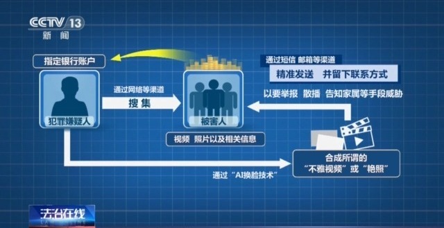 警方介绍,在这些案件当中,犯罪嫌疑人先是通过网络等渠道,搜集被害人的视频、照片以及相关信息。再通过AI换脸技术PS合成所谓的“不雅视频”或“艳照”,然后通过短信、邮箱等渠道,精准发送给选定的对象并留下联系方式,最后以要举报、散播、告知家属等手段威胁选定的对象,要求被害人将钱汇到他们指定的银行账户。