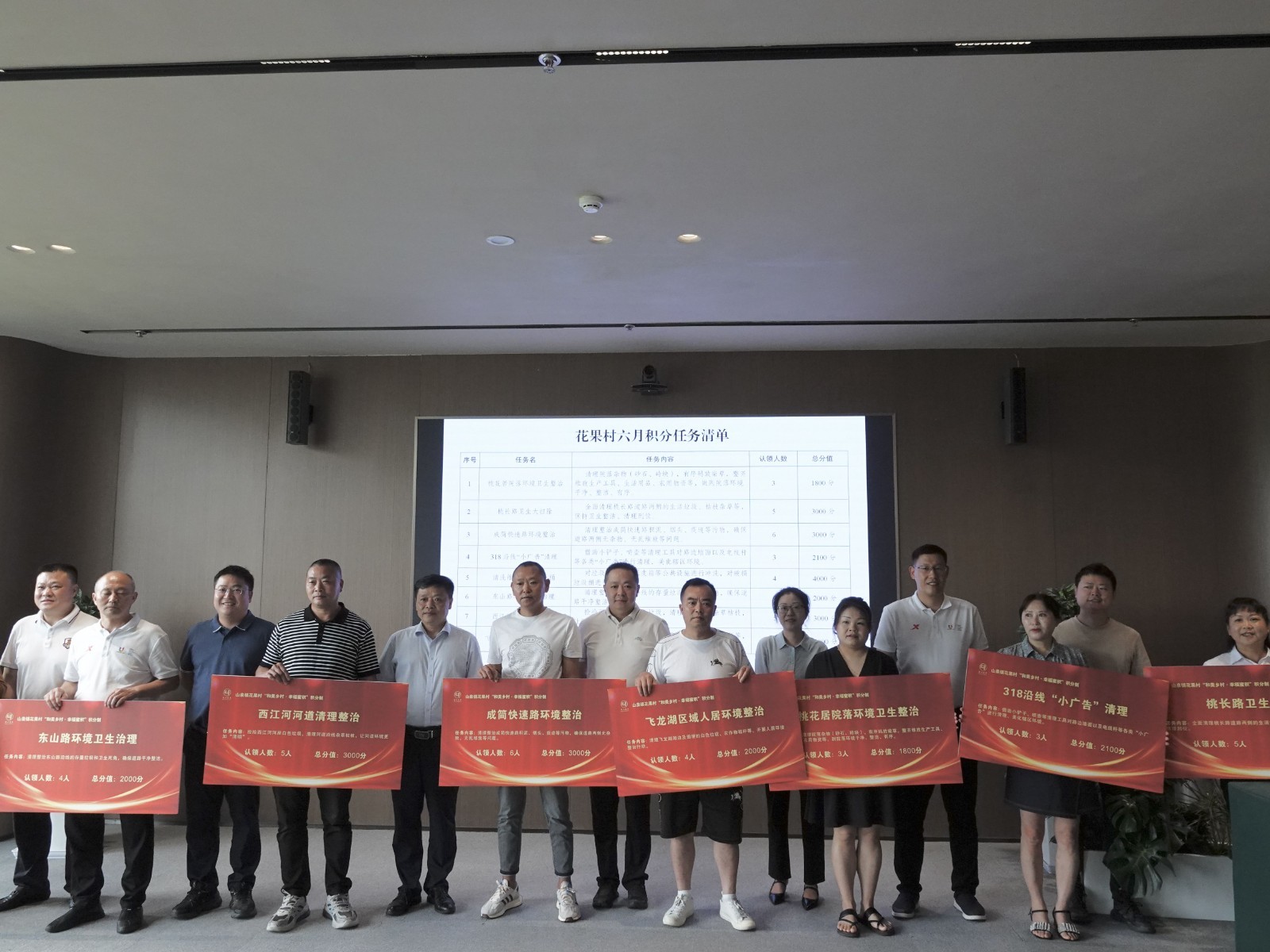 启动仪式现场还发布了《花果村6月积分任务清单》,并由8名村民代表上台领取了相关任务。这些任务既包括清理院落杂物、保持环境整洁等日常家务,也包括参与飞龙湖湖边及田埂的环境整治等公共事务。通过完成这些任务,村民可以累计积分,并在村上的积分超市兑换各种生活用品。