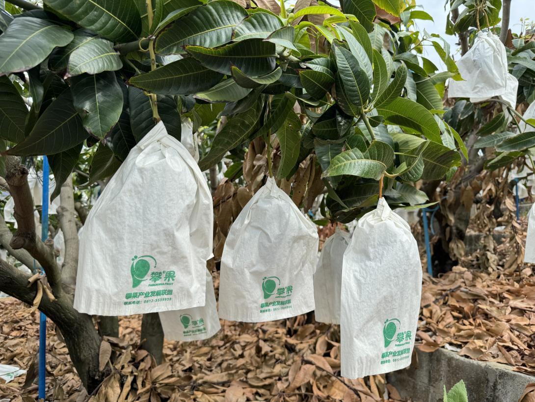 “这个是锐华1号,这棵树上的是凯特芒果,这一片都是贵妃芒……”记者来到金河村芒果基地时,正值基地内芒果套袋时期,果农们给一颗颗饱满的芒果都整齐划一地穿上印有“攀果”标志的“统一制服”,等待着它们成熟的时刻。“我们的芒果光洁圆润、色泽自然,含糖量在14%至23%,同一品种比国内其他产区高1至3个百分点。”冯正伟自豪地说。
