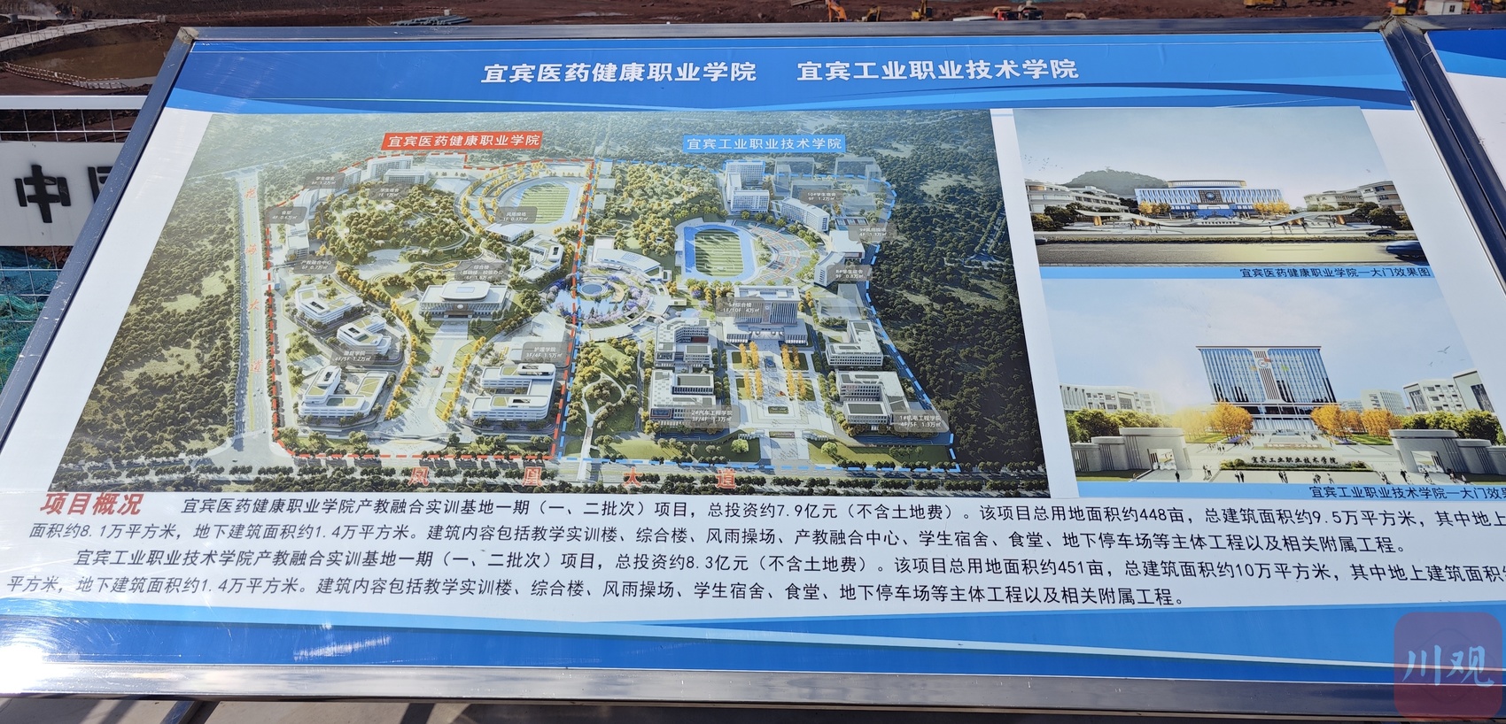 “十四五”期间,宜宾将新增宜宾医药健康职业学院和宜宾工业职业技术学院两所高校,均位于南溪。今年4月,宜宾医药健康职业学院和宜宾工业职业技术学院同时开工建设。在现场建设图中可以看到,两所院校位置紧邻,占地面积相当,均为440亩左右。“这两所学校首期建成后,师生可达1万人左右。”南溪区高推办专班负责人侯洁说。