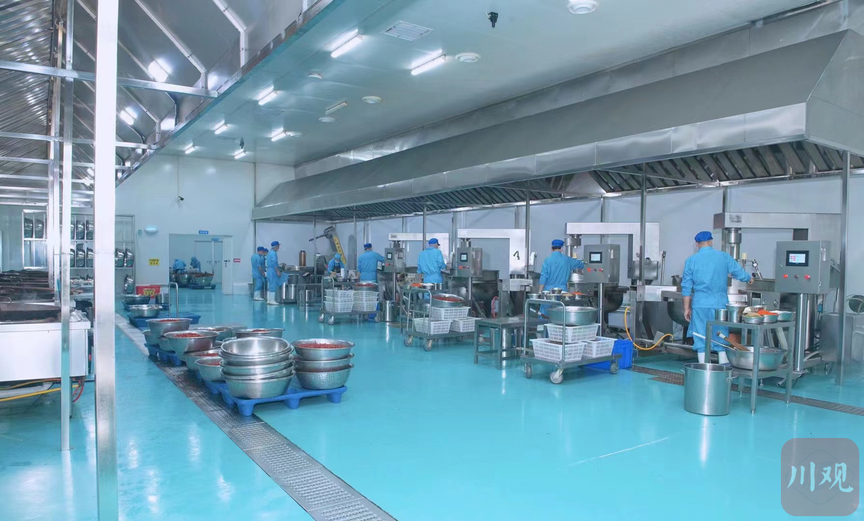 自贡市谭八爷商贸有限公司生产车间,工人正在炒制冷吃兔。