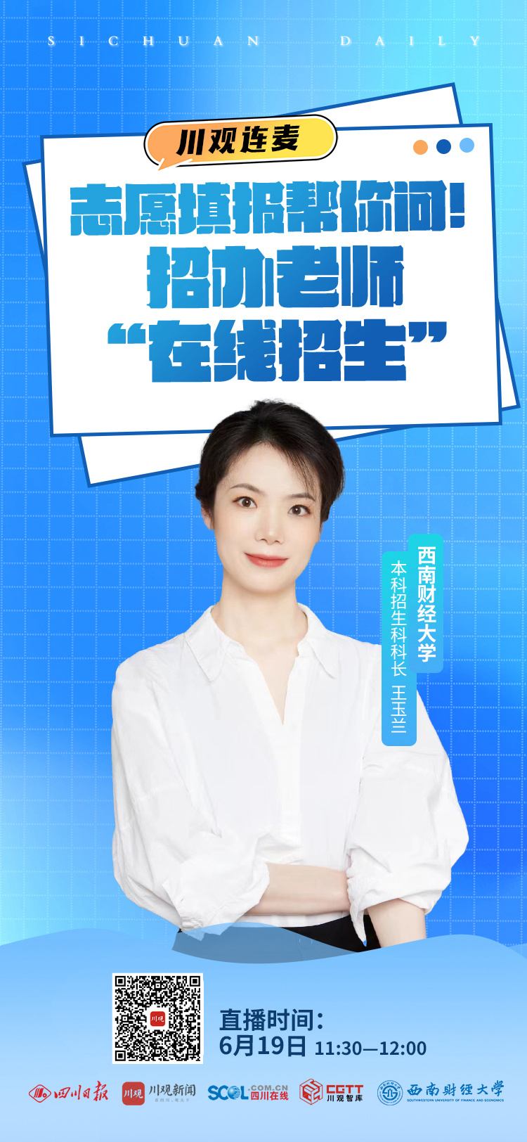 2024年高考放榜在即,6月19日上午,四川日报·川观新闻推出“志愿填报帮你问!招办老师‘在线招生’”特别节目。西南财经大学本科招生科科长王玉兰直播连麦,回答了广大考生和家长们关心的问题。