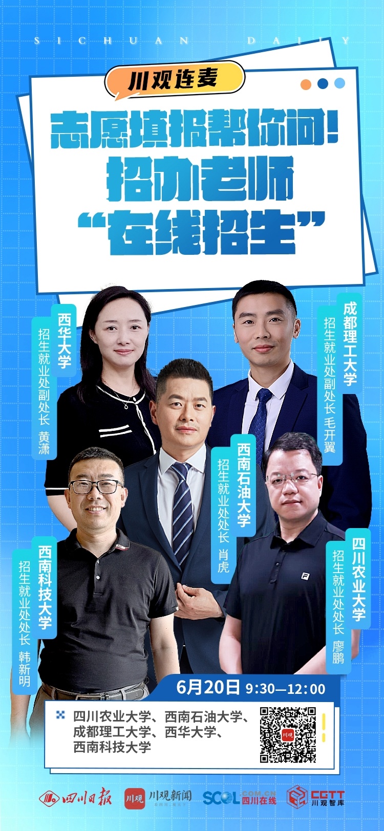 6月20日9:30—12:00,川观新闻推出的“志愿填报帮你问!招办老师‘在线招生’”特别节目迎来第二场,邀请西南石油大学、四川农业大学、西南科技大学、成都理工大学、西华大学的招办老师直播连麦,与考生和家长们一起来聊聊志愿填报的相关问题。