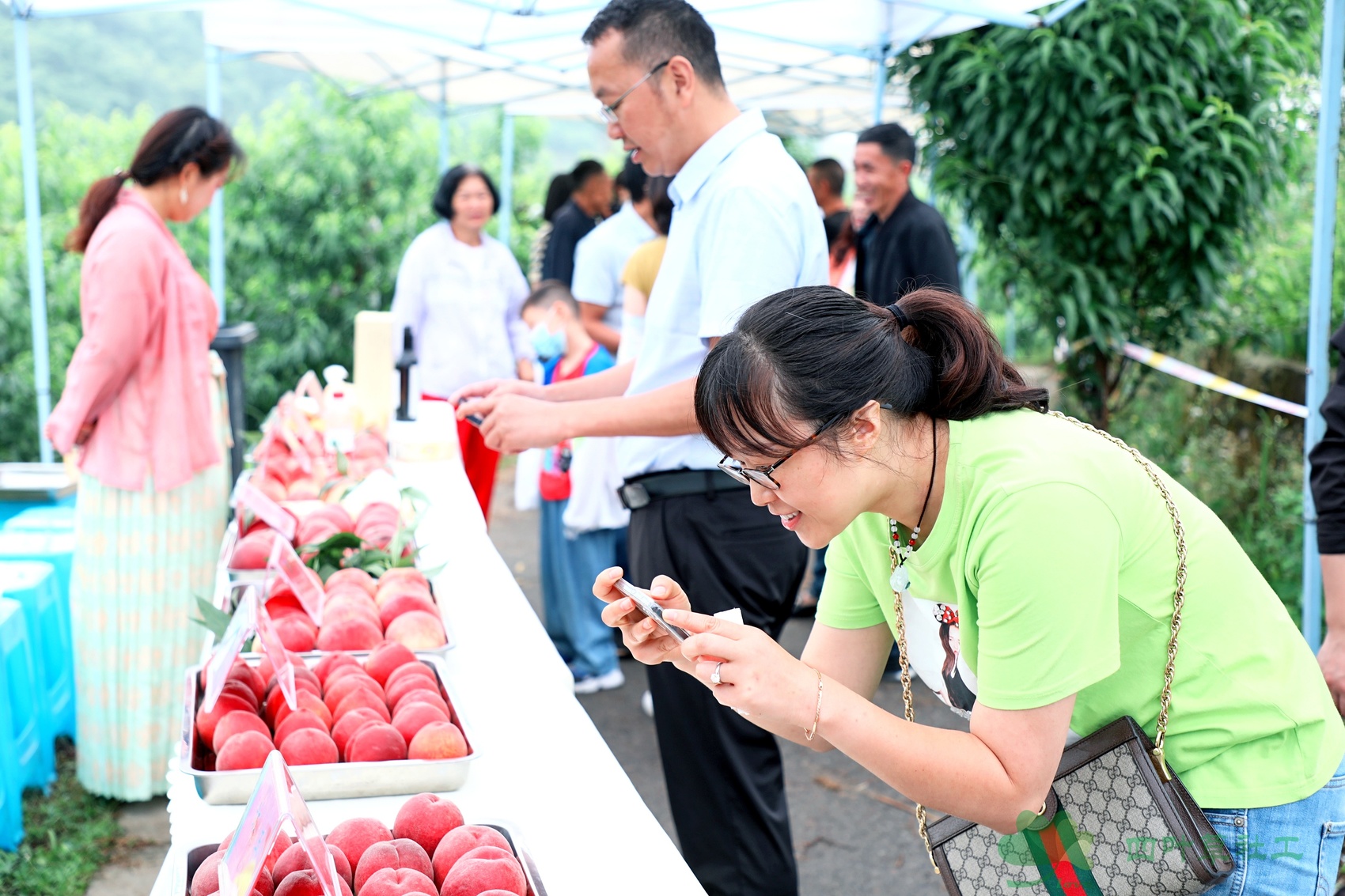 龙泉驿水蜜桃开园采摘节现场,卖相、味道俱佳的水蜜桃惹人喜爱。龙泉驿区柏合街道供图