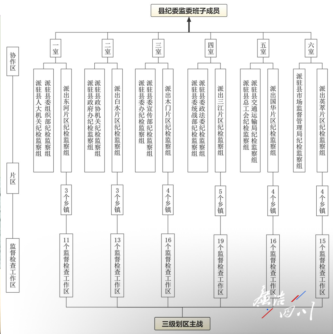 “为推动基层纪检监察工作更有目标、更有组织、更有章法,我们在盘活用好有限监督资源和力量上下功夫,在县乡村‘三级’划分协作区、片区、监督检查工作区。”旺苍县纪委监委相关负责人介绍,在保持全县纪检监察机构现有编制、职数和人员稳定的基础上,对全县纪检监察力量进行优化整合,建立了6个县级协作区、6个乡镇片区、90个村级监督检查工作区,并由一个协作区联系一个片区,一个片区联系多个乡镇,协同开展监督检查和案件查办等工作。