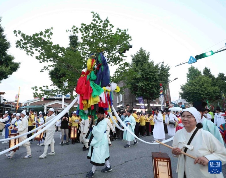 当地时间6月8日,韩国江陵民众身着传统服饰参加一年一度的民俗联欢。正值韩国江陵市一年一度的端午祭庆典期间,当地举行形式多样的民俗联欢活动,向游客展示传统民俗文化。新华社记者 姚琪琳 摄