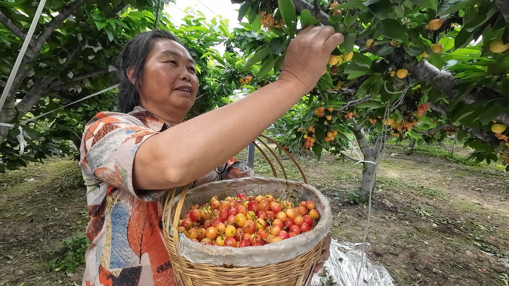 冯芝兰正在采摘“冰壶”甜樱桃。