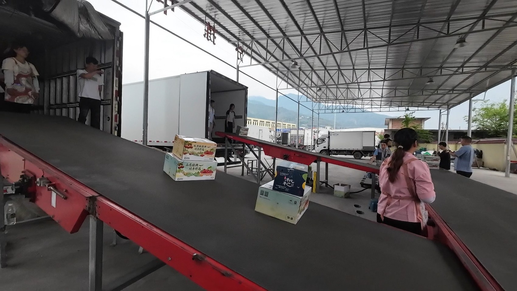下午5点,顺丰设立在九襄镇的中转场里车流不断,装满甜樱桃包裹的物流车从清溪镇驶来,紧接着,物流车里的包裹被送上传送带,转移至专门长途运输甜樱桃的冷链物流车。