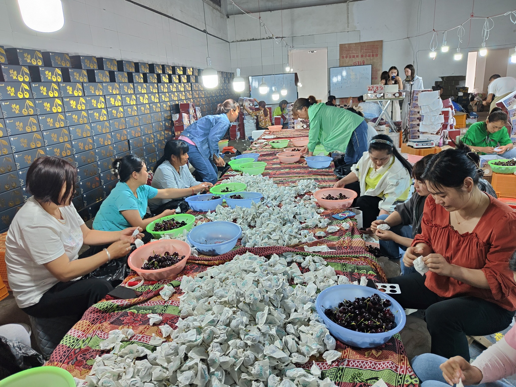 这个时候,冯芝兰也将今天采摘的第一批甜樱桃送回家,这批果要通过生鲜快递发往外省。发电商前的打包工作是一件细活,需要心细、眼快、手轻,负责这项工序的人需要将套袋果外面的一层纸袋撕开一个口子,查看果的品质。“偏红的,个小的,品相不好的裂果、坏果,都要挑出来,只留下猪肝红色、品相较好的果,才能能代表汉源‘黑珍珠’的品质。”当地果农告诉记者。