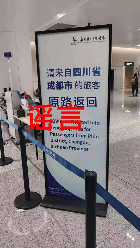 就此,川观新闻记者求证了刚刚在南京禄口国际机场下飞机的网友@手术灯。据他拍摄的现场视频显示,标识牌上显示的内容为“请来自四川省成都市郫都区的旅客主动到此申报登记”,并非是网上流传的“请来自四川省成都市的游客原路返回”。