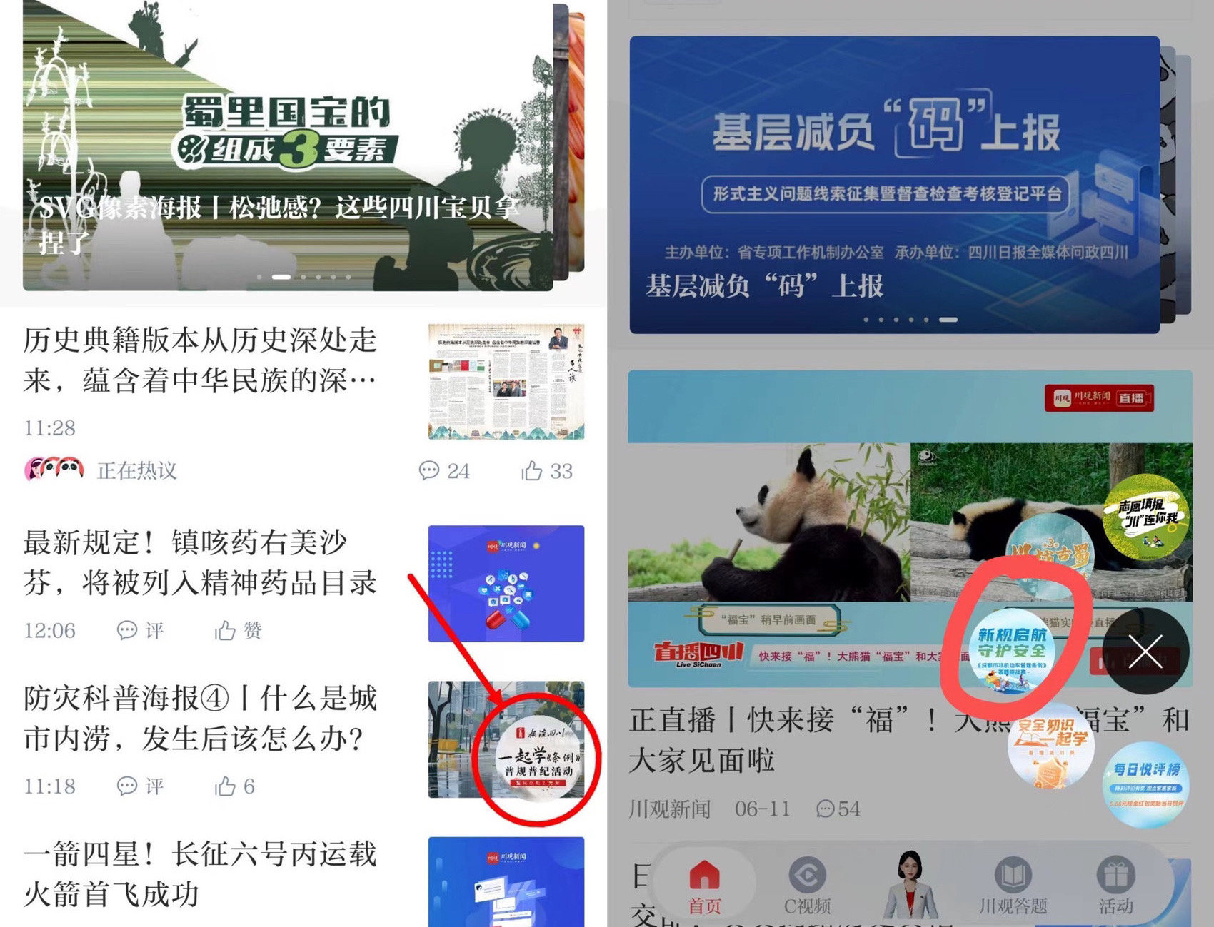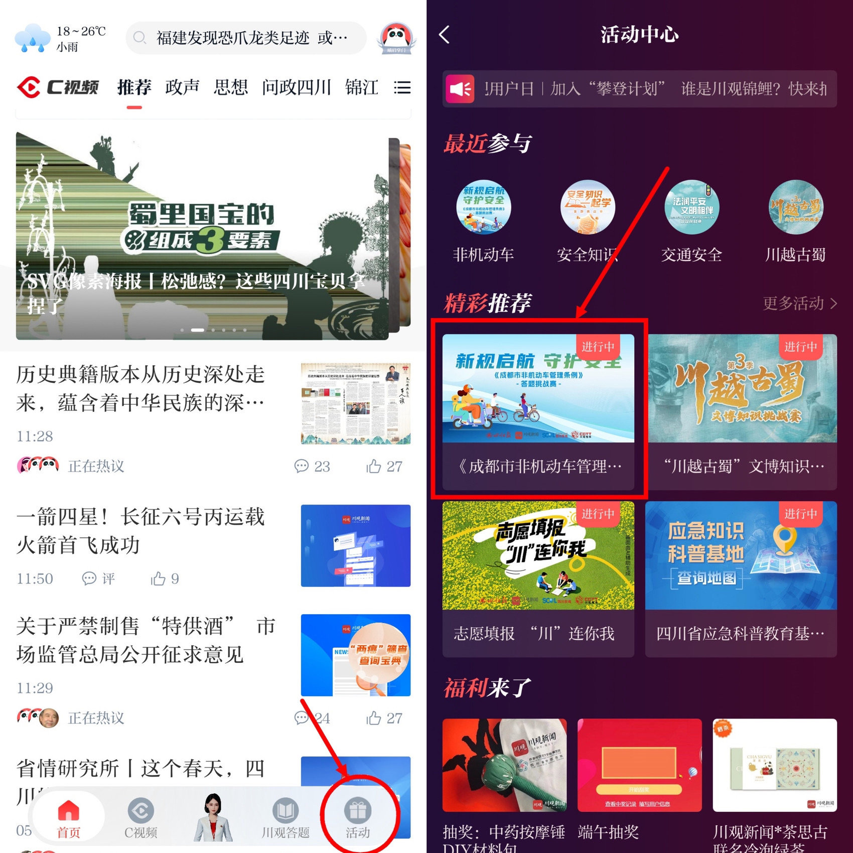 方式三:在川观新闻首页,点击“活动”,找到“新规启航 守护安全 ——《成都市非机动车管理条例》答题挑战赛”活动图片,点击即可参与答题;