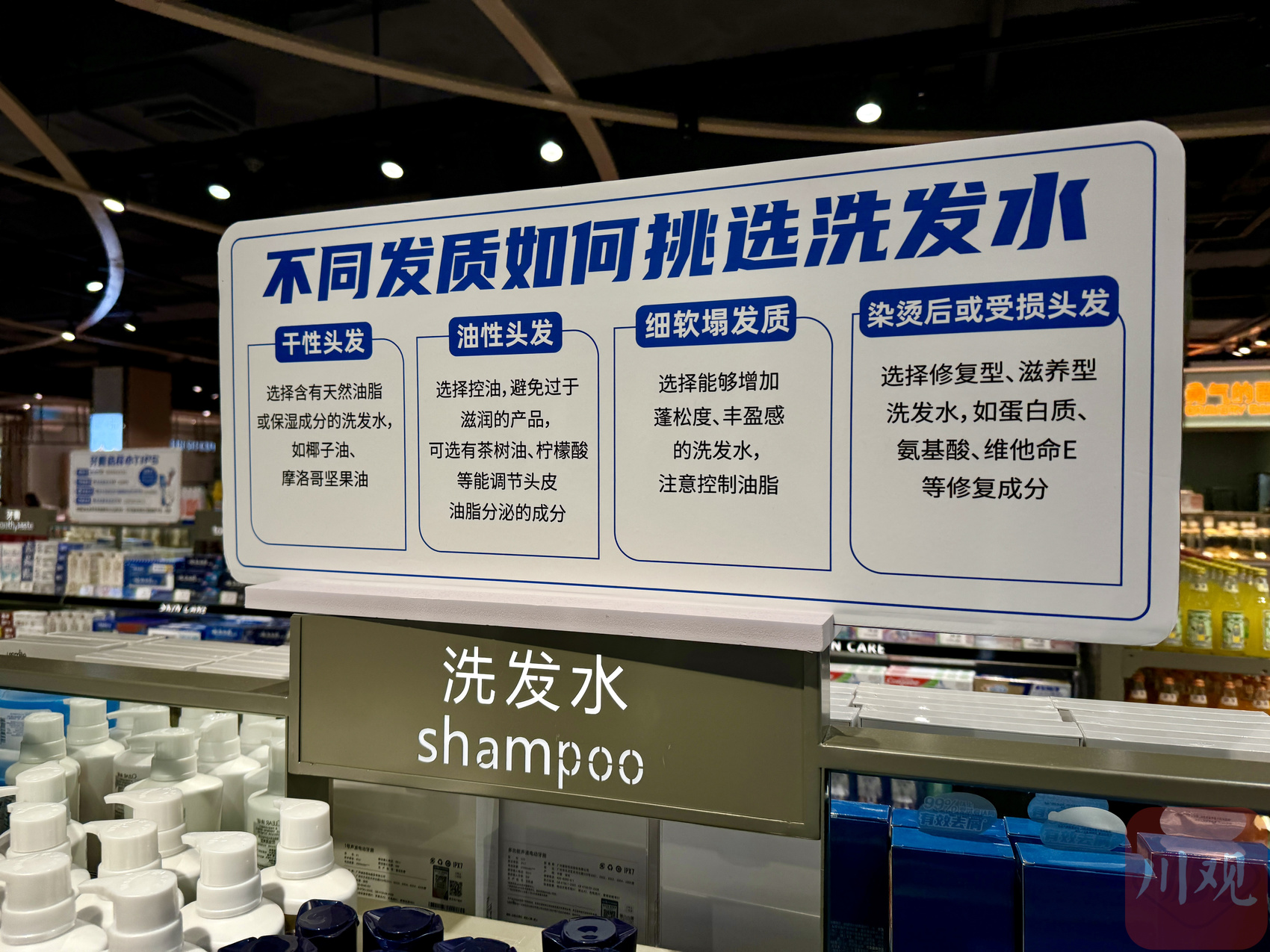 成都邻你超市东安湖店围绕情绪价值层面为顾客贴心准备洗发水选购提示。