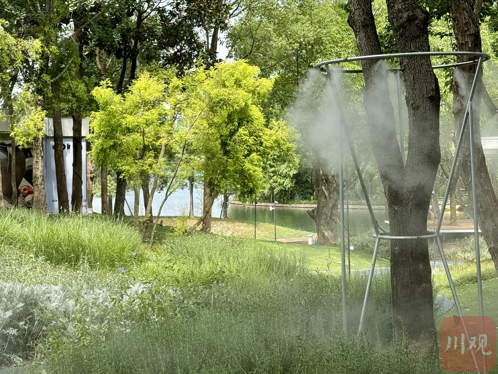 麓湖cpi花园间喷洒水雾为户外消费打造舒适环境。