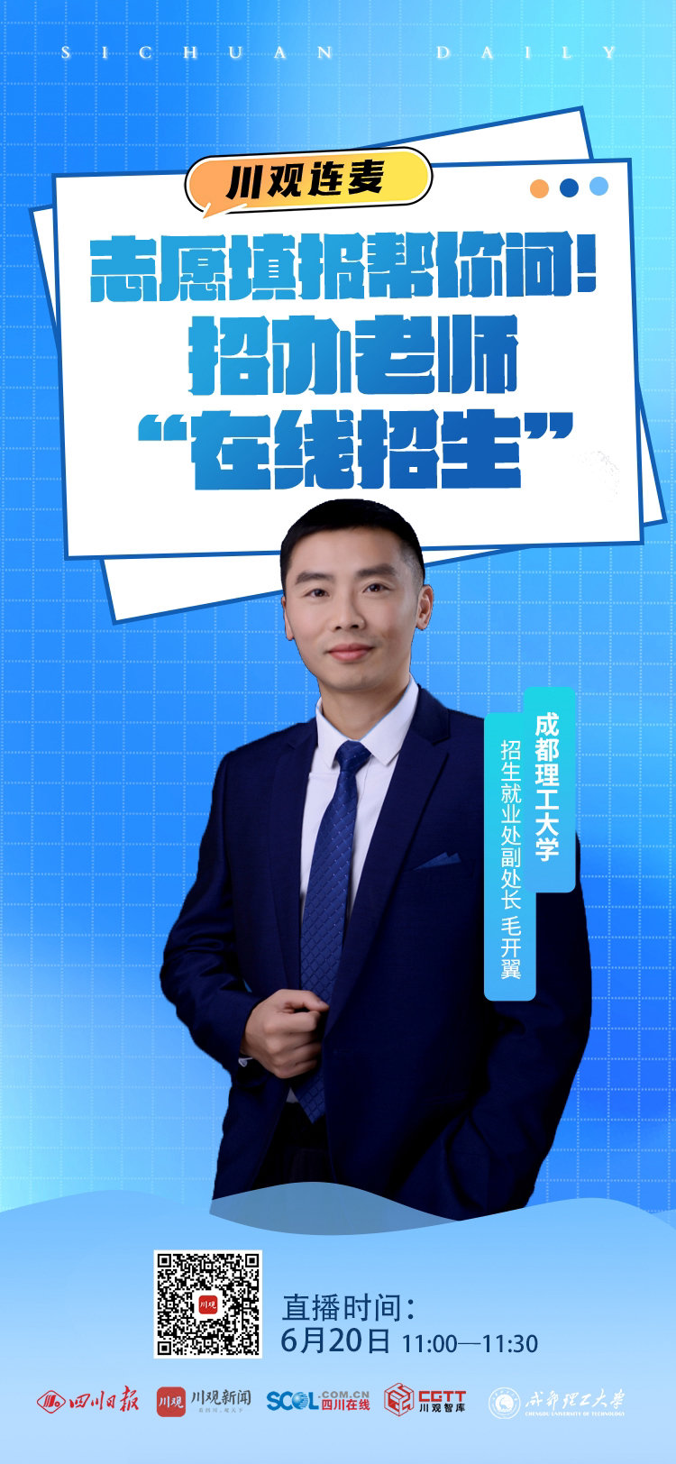 6月20日,四川日报·川观新闻继续推出“志愿填报帮你问!招办老师‘在线招生’”特别节目。成都理工大学招生就业处副处长、招生办主任毛开翼直播连麦,回答了广大考生和家长们关心的问题。