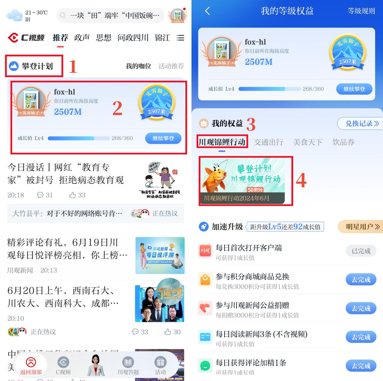 2、在川观新闻首页,点击“攀登计划”—“我的权益”,找到“攀登计划·川观锦鲤行动6月”活动图片,根据提示参与抽奖。