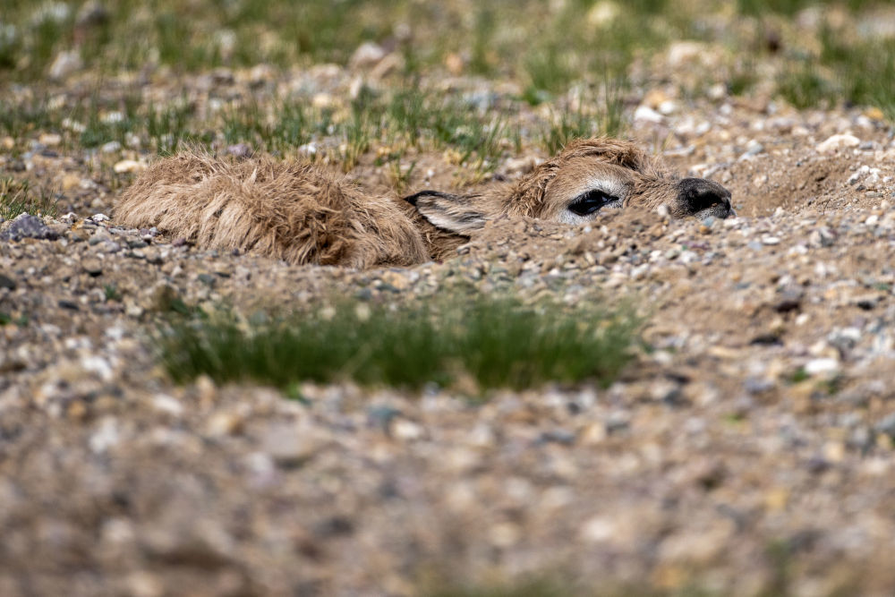 六月,西藏自治区那曲市申扎县买巴乡,在平均海拔超过5000米的羌塘国家级自然保护区鲁确塘草原,与羊群距离数十米的草地上,一只体态略显臃肿的母藏羚羊独自来回跑动。终于,她缓缓躺下。