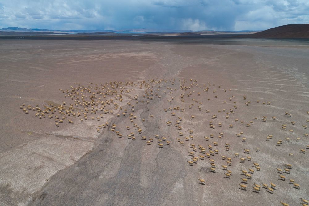 藏羚羊在羌塘保护区核心区向产羔地迁徙(6月13日摄 无人机照片)。新华社记者 旦增尼玛曲珠 摄