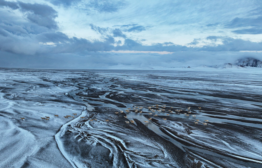 这是在甜水河畔荒滩雪地中向产羔地迁徙的藏羚羊(6月14日摄 无人机照片)。新华社记者 普布次仁 摄