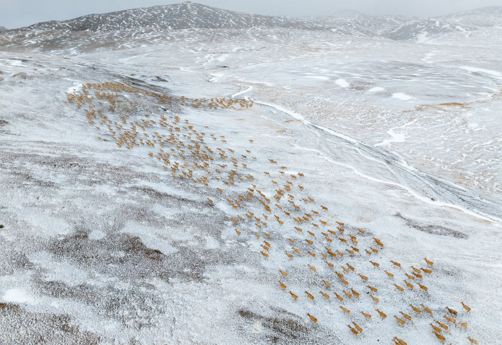 藏羚羊在向产羔地迁徙(无人机照片,5月10日摄)。新华社记者 姜帆 摄
