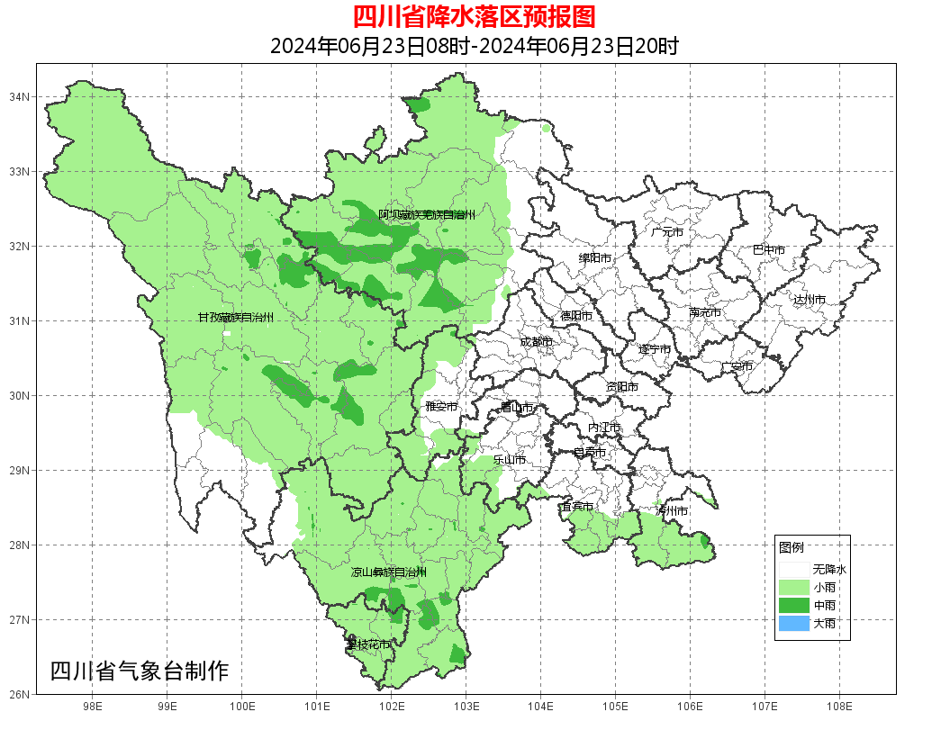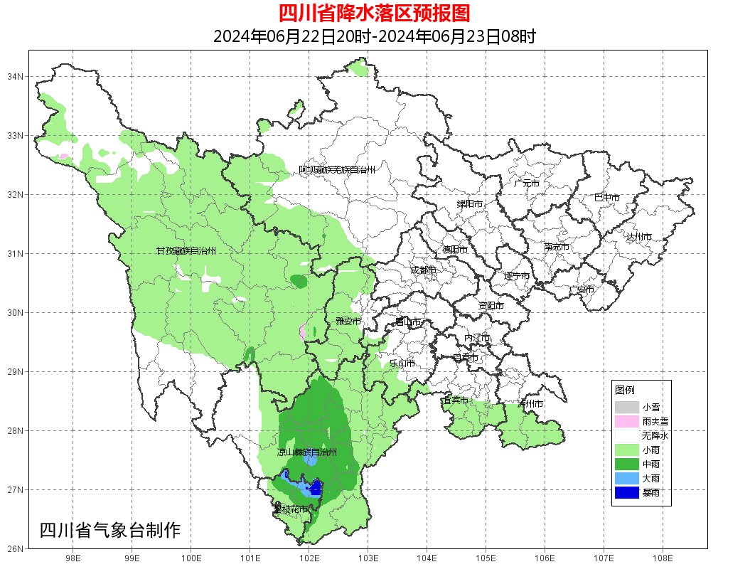 盆地大部多云,西南部南部山区有分散阵雨或雷雨;甘孜州大部、阿坝州西南部多云间阴有阵雨或雷雨,局部有中雨;攀西地区大部阴天间多云有阵雨或雷雨,雨量小到中雨,其中攀西地区南部局地有大雨,个别暴雨。