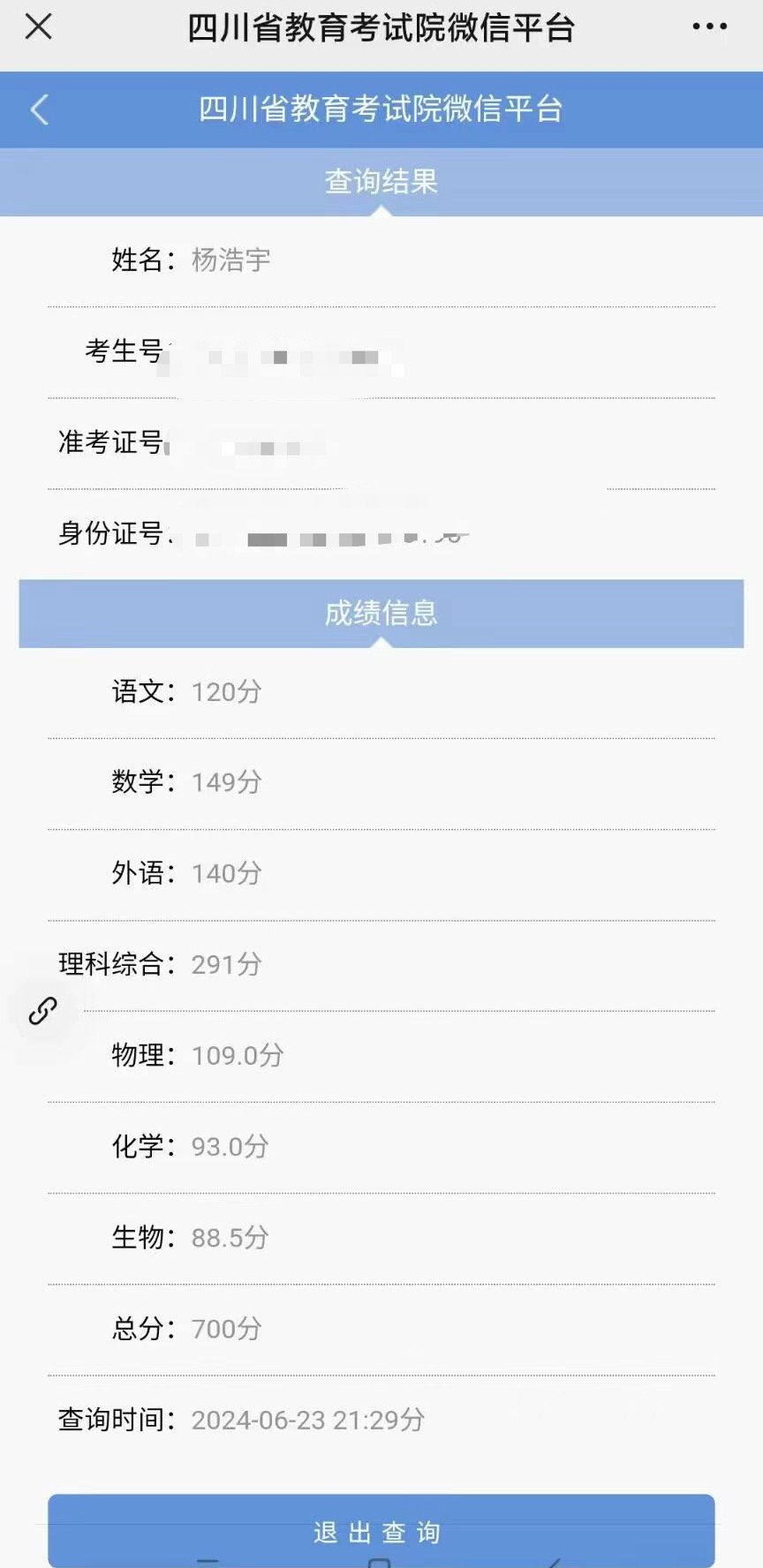 6月23日晚,2024年四川高考成绩已经可以查询。记者从四川省安岳中学获悉,该校考生杨浩宇取得了700分的优异成绩。