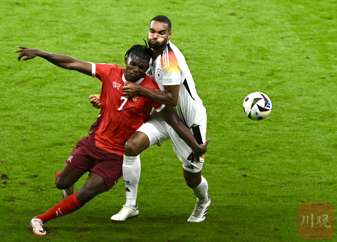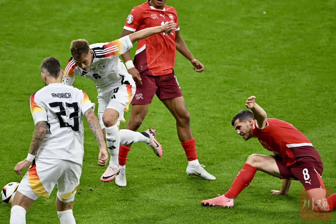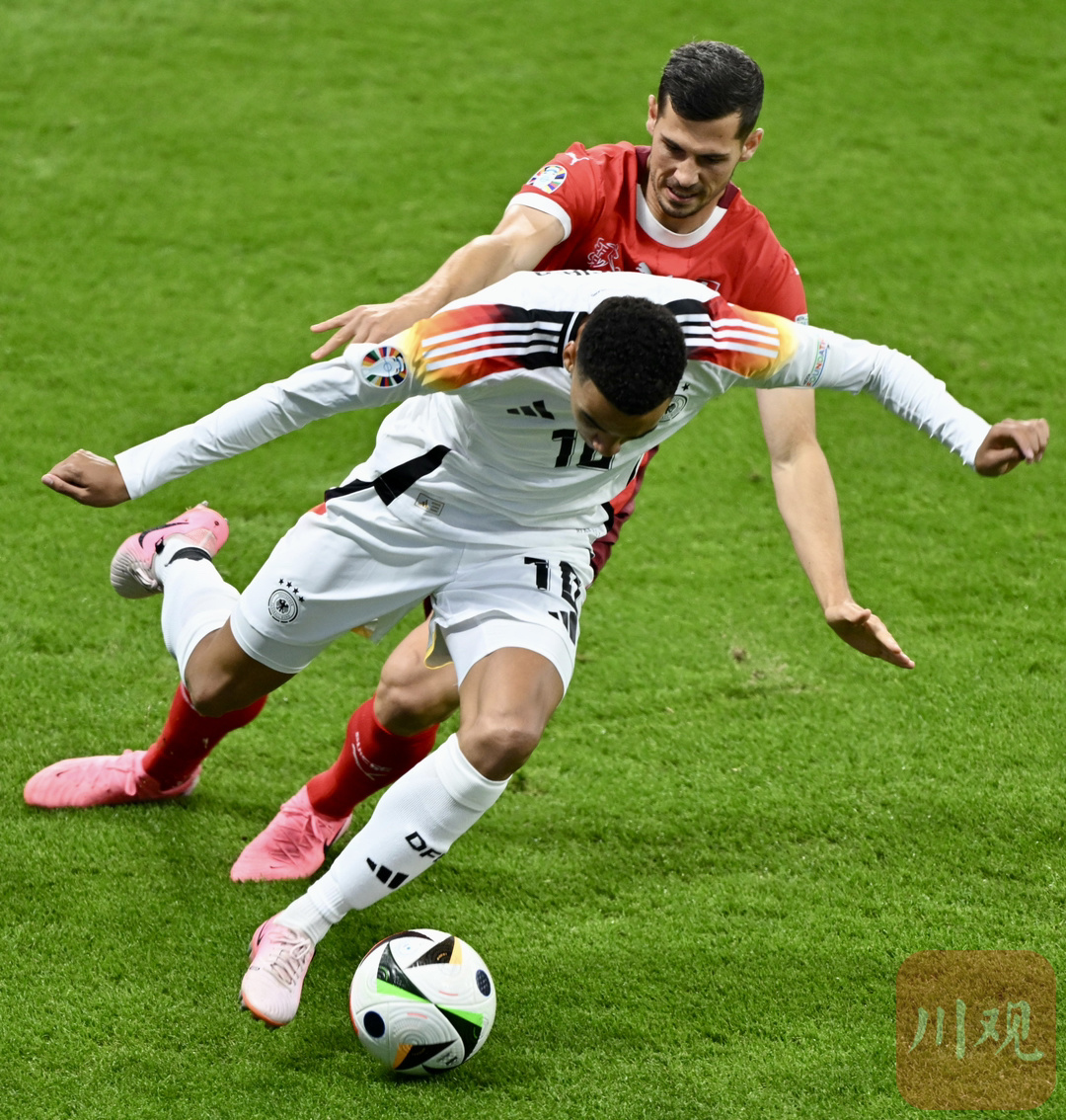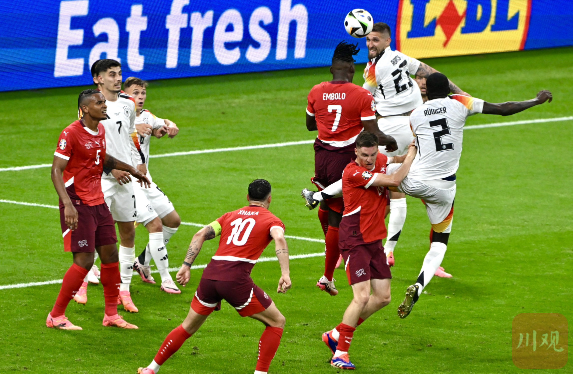 北京时间6月24日凌晨3点,2024欧洲杯A组小组赛第三轮,东道主德国在法兰克福与瑞士交手。上半场德国队安德里希抽射破门,但因队友穆西亚拉犯规在先被吹无效,瑞士队弗鲁勒助攻恩多耶破门,半场瑞士1-0领先德国。下半场瑞士队巴尔加斯进球越位被吹,哈弗茨头球击中横梁。补时阶段德国队菲尔克鲁格头球破门,德国1-1逼平瑞士,2胜1平积7分小组第一出线,瑞士1胜2平积5分小组第二同样晋级。