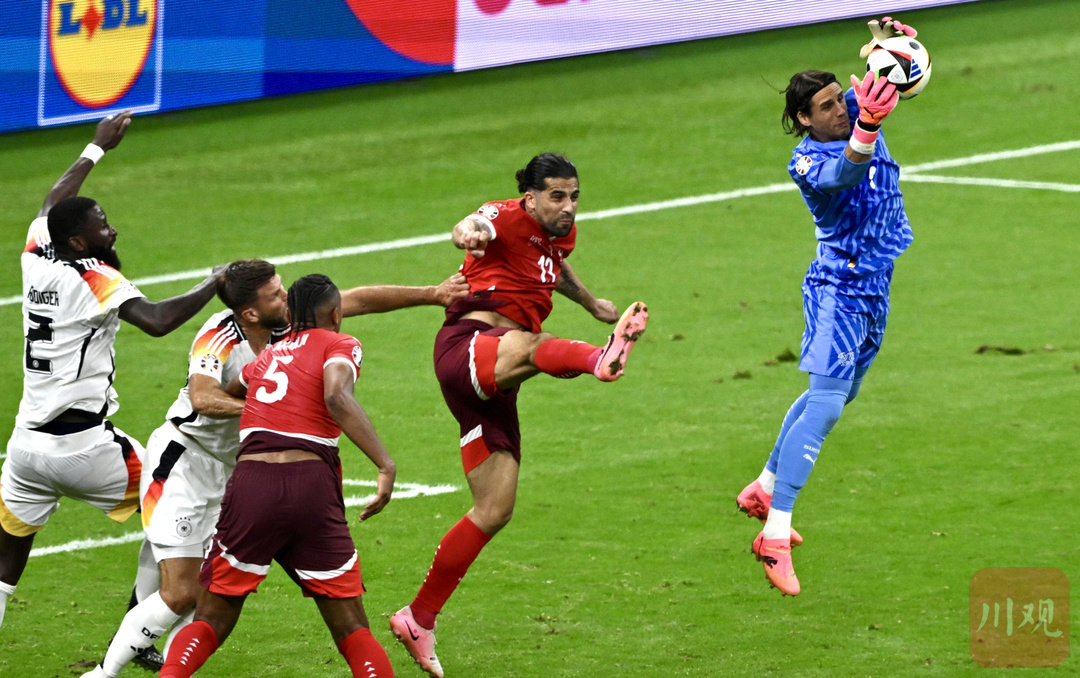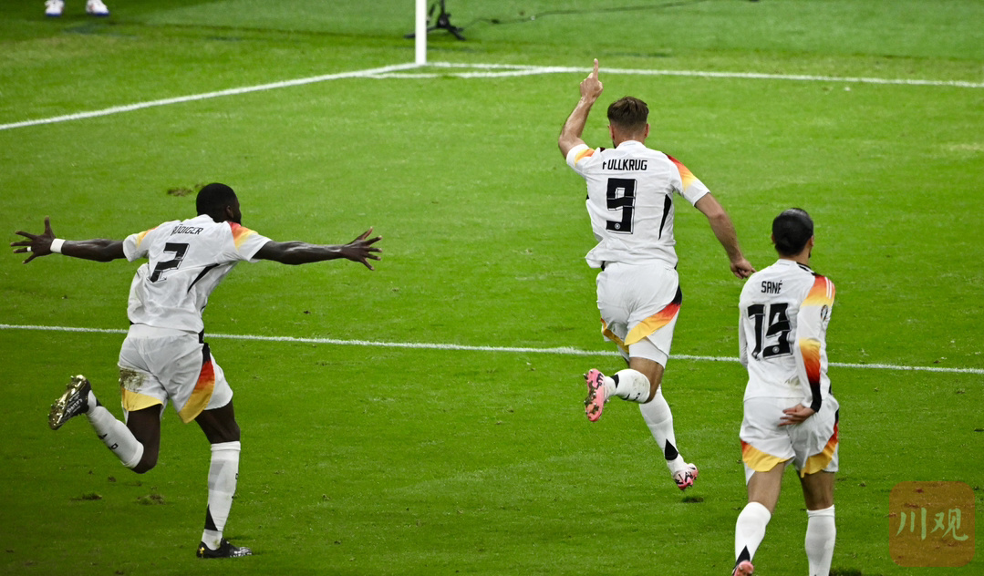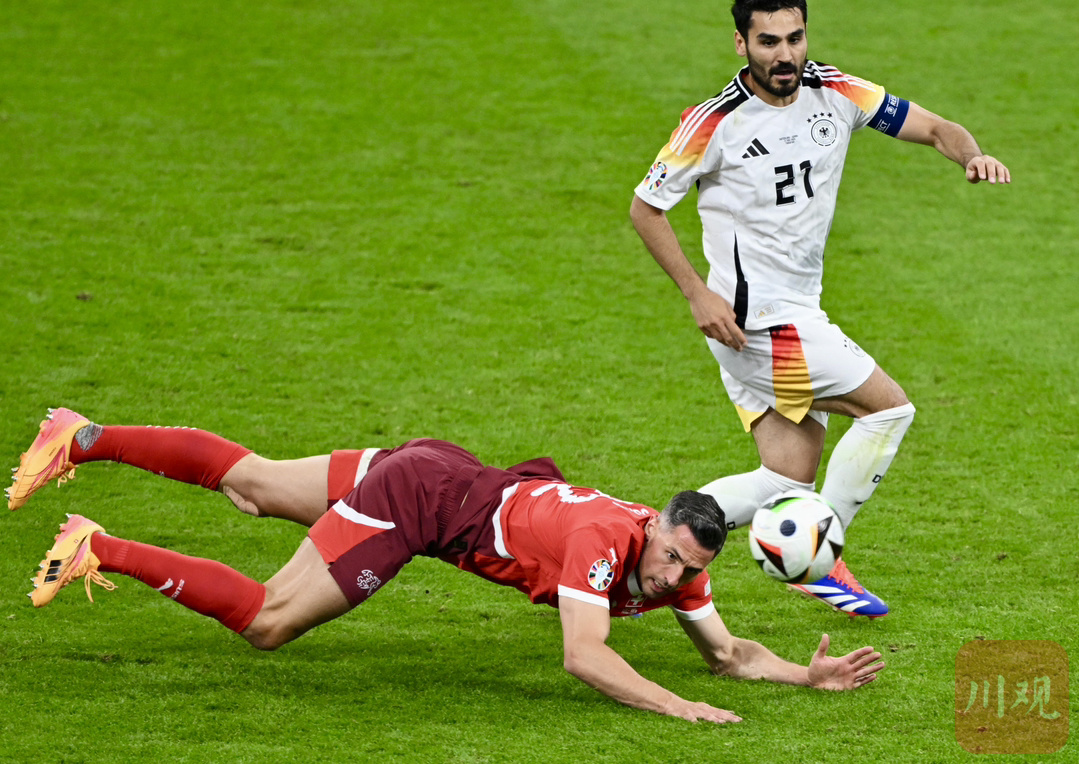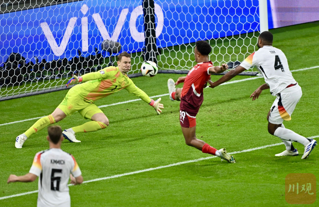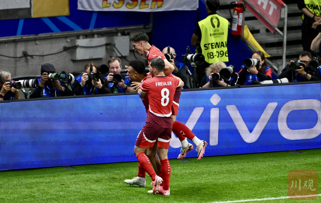 北京时间6月24日凌晨3点,2024欧洲杯A组小组赛第三轮,东道主德国在法兰克福与瑞士交手。上半场德国队安德里希抽射破门,但因队友穆西亚拉犯规在先被吹无效,瑞士队弗鲁勒助攻恩多耶破门,半场瑞士1-0领先德国。下半场瑞士队巴尔加斯进球越位被吹,哈弗茨头球击中横梁。补时阶段德国队菲尔克鲁格头球破门,德国1-1逼平瑞士,2胜1平积7分小组第一出线,瑞士1胜2平积5分小组第二同样晋级。