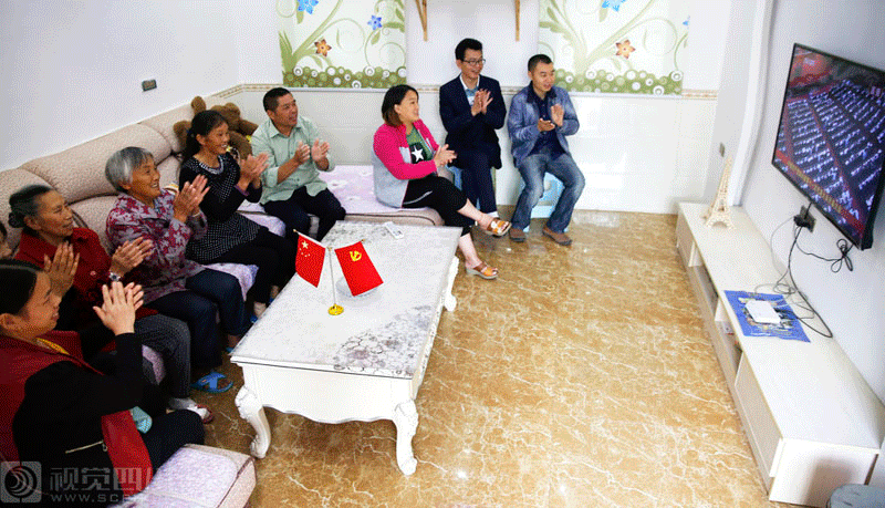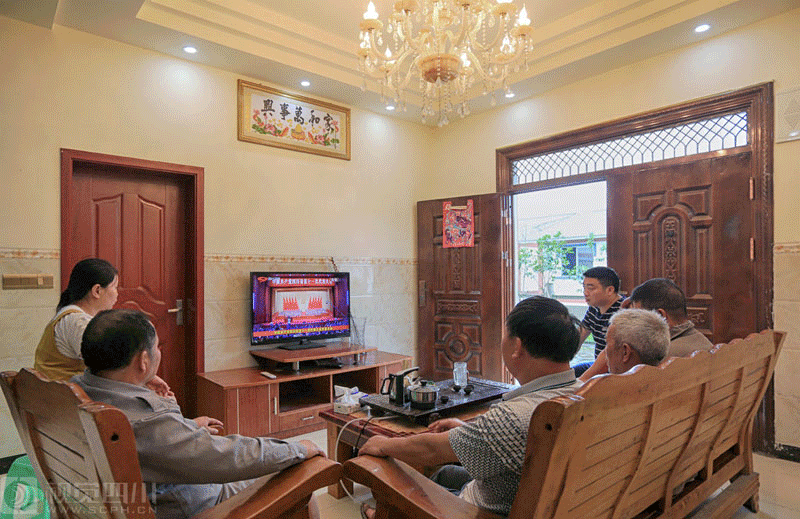 华蓥市阳和镇偏岩子新村易地扶贫搬迁户张小华的新居内,部分村民一起收看党代会开幕直播。游青 摄