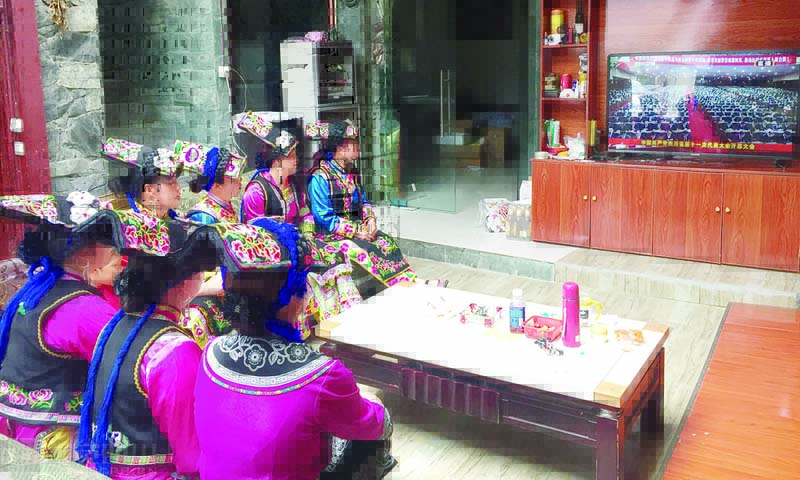 阿坝州茂县南新镇牟托村潘敬平家中,羌族群众一起收看党代会开幕实况。张娅 摄