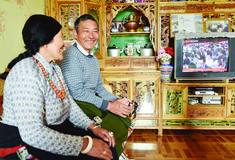 阿坝州红原县安曲镇下哈拉玛村,牧民泽尔多与妻子一起在家观看党代会开幕直播,畅谈对未来的希望。吴夏原 摄